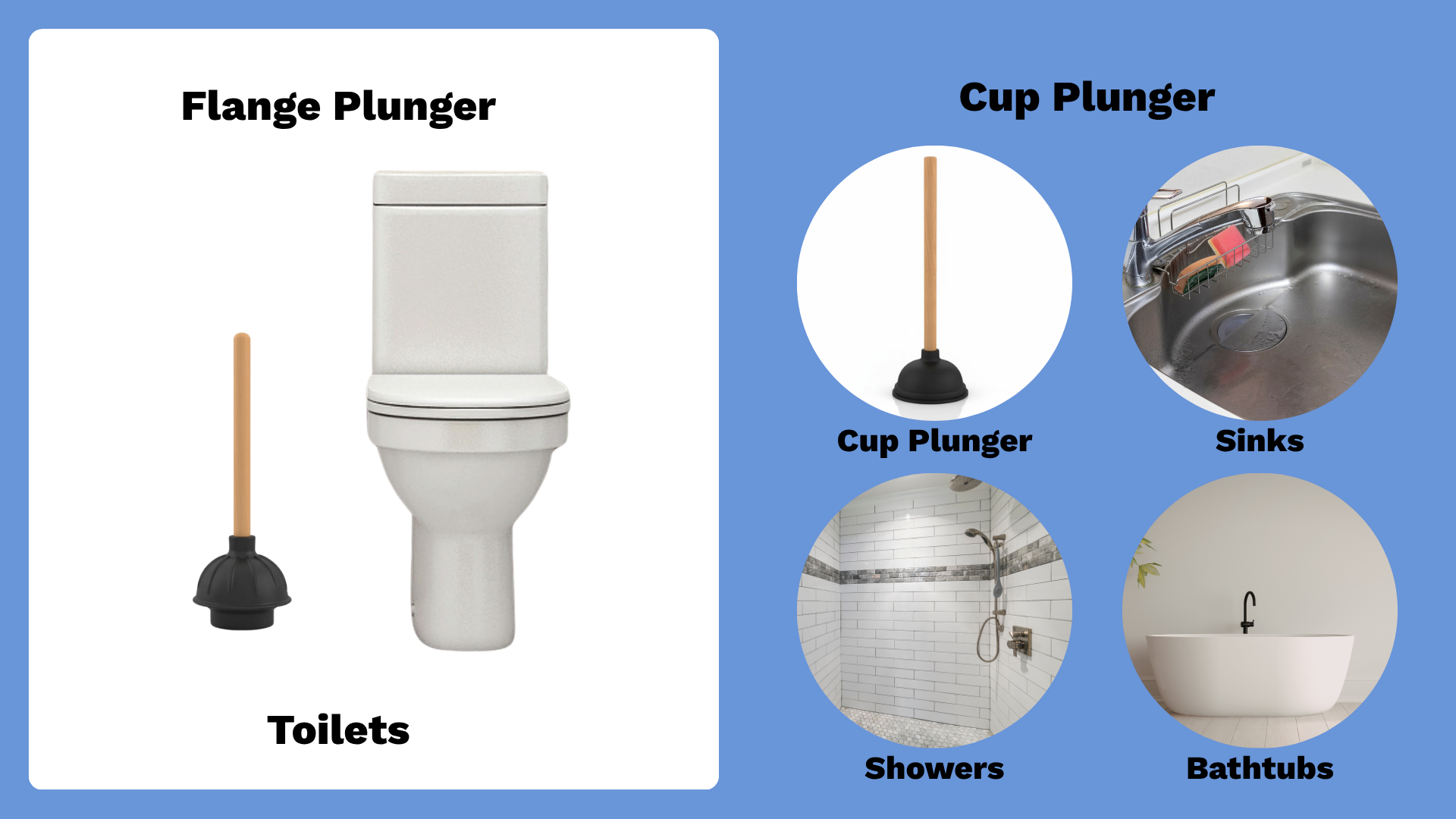 The Cup Plunger: Features a flat-bottomed rubber head. It is designed for flat surfaces like kitchen sinks, bathtubs, and showers to create a vacuum over the drain.
